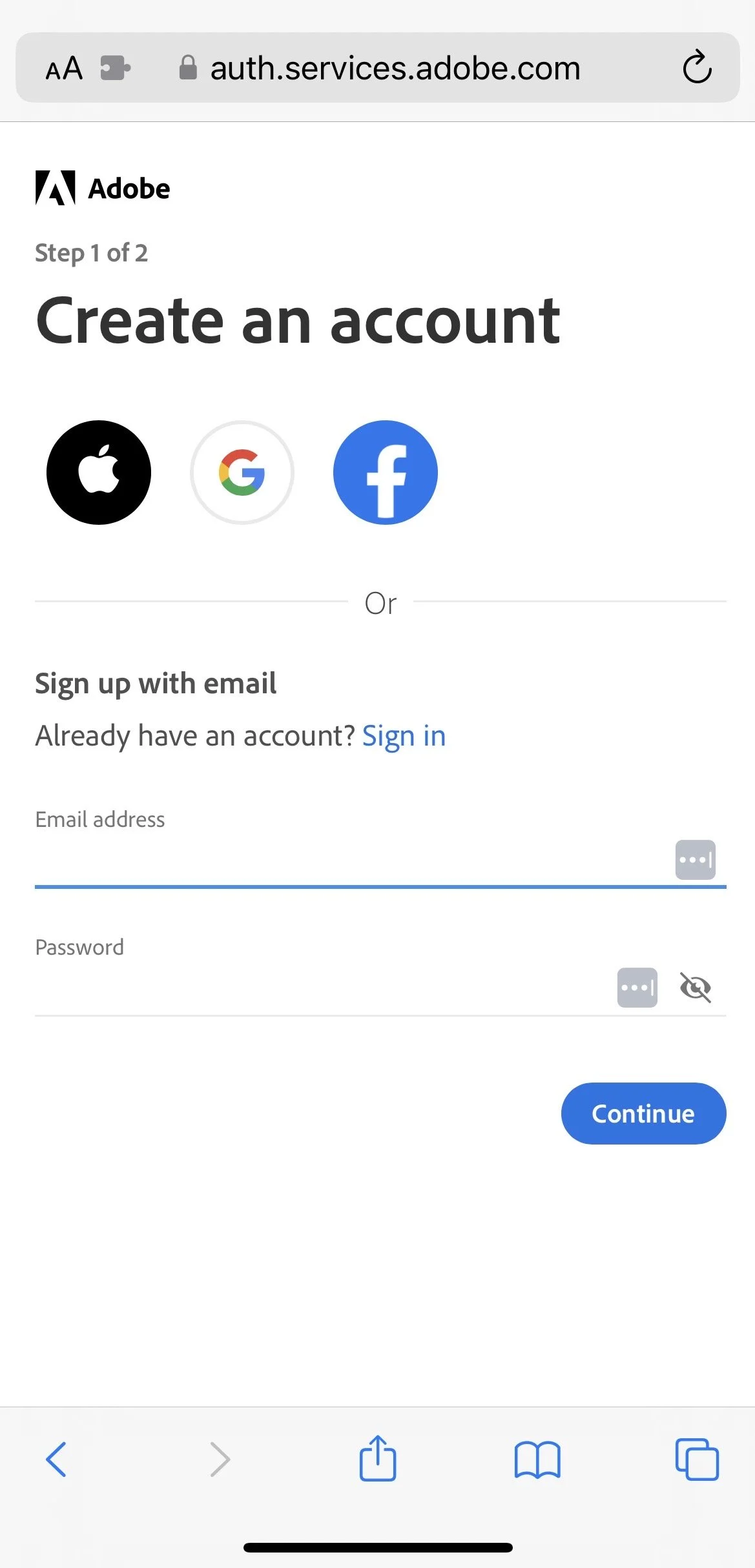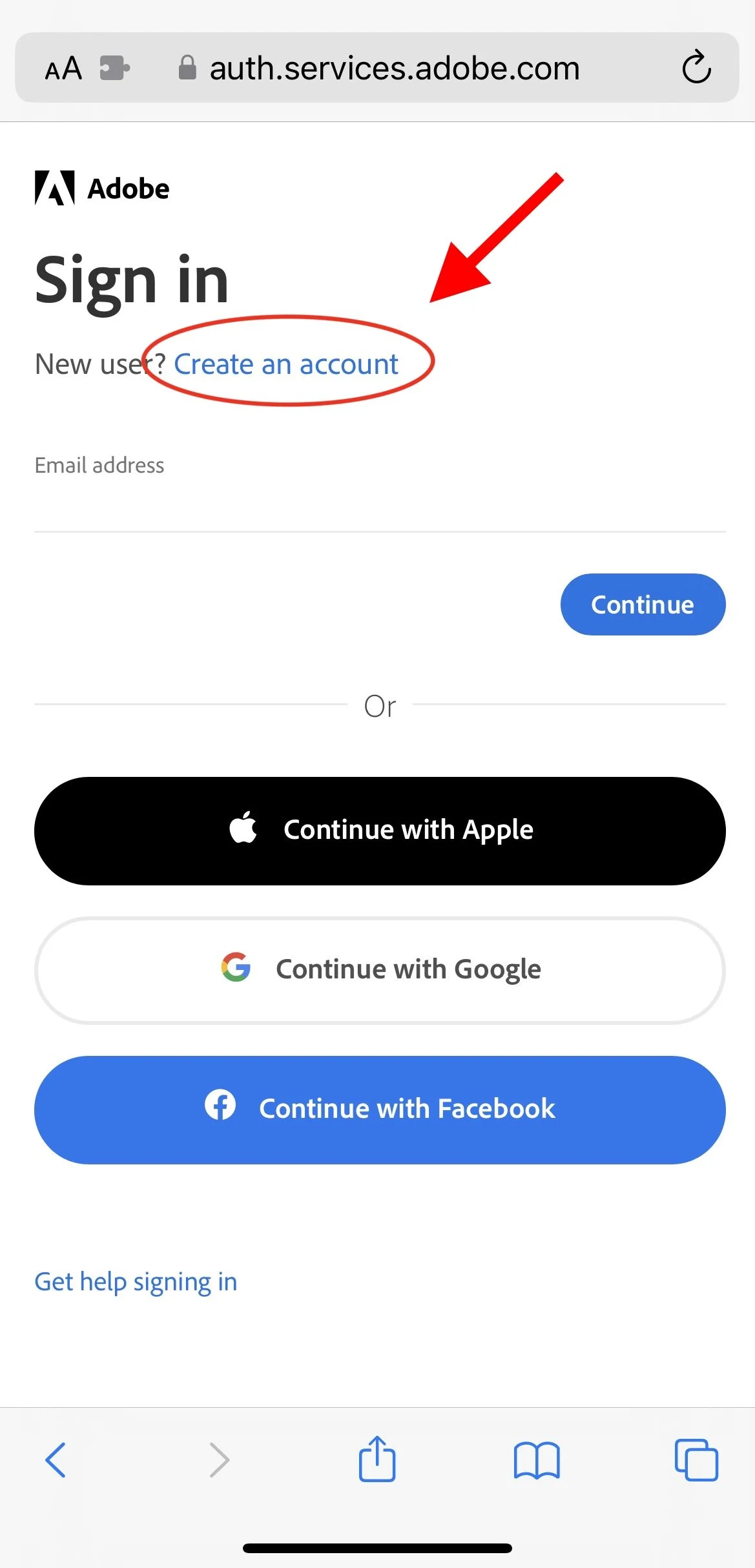 Choose how you want to create your free Adobe account. You can choose to create an account by choosing which service you want use to sign in or by using your email address and choosing a password.